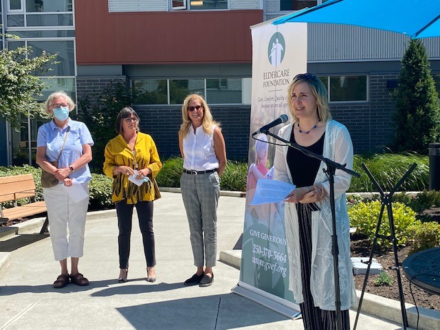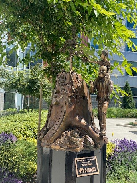 Secondly, Eldercare commissioned a beautiful bonze statue called Circle of Life, located in the courtyard garden of the Summit long-term care home in Quadra Village, Victoria. At the unveiling, Tim Orr, Island Health’s former long-term care director said: “Tom was a staunch advocate for long-term care and was instrumental in encouraging leaders to develop a medical model that provides enhanced care for residents and support for the staff team.”