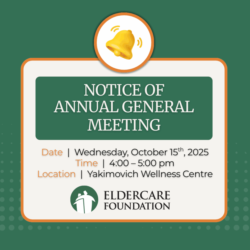 Eldercare Foundation will hold its Annual General Meeting on Wednesday, October 15, 2025, from 4:00 – 5:00 pm at the Yakimovich Wellness Centre.